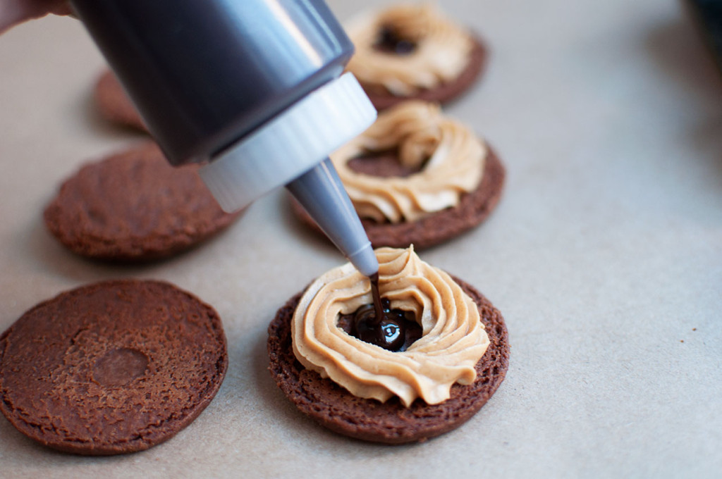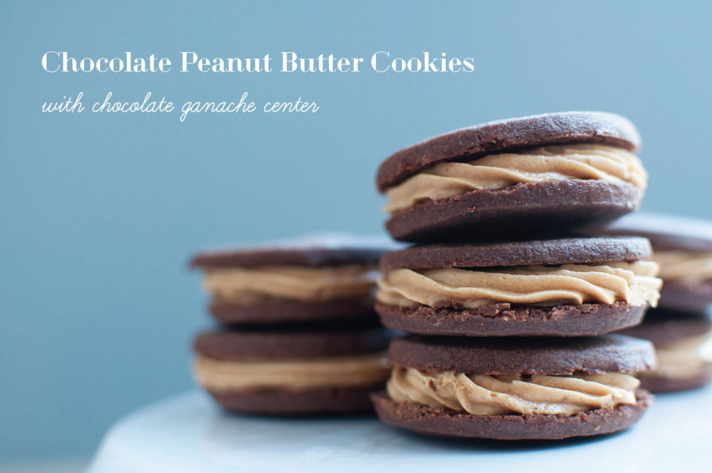 Peanut butter and chocolate, the perfect pair. This past weekend was spent browsing through cookbooks and foodie magazines. The inspiration for this cookie comes from the Bouchon Bakery book where they did their take on an oreo with perfect scalloped chocolate shortbreads. The cookies were gorgeous to look at. I wanted to do my take on the “reese peanut butter cup” and alas this chocolate peanut butter cookie recipe was born. With this recipe, it’s peanut butter frosting and a dollop of rich chocolate ganache sandwiched between two crunchy cocoa cookies. I went a little camera happy this time and this post is filled with lots of pictures. Hope you enjoy!